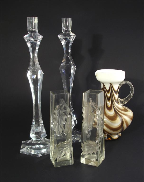 A pair of clear and frosted glass vase probably Moser, decorated with Holly sprays, and a pair of faceted glass candlesticks similar and a jug unmarked, minor nicks 20cm. high