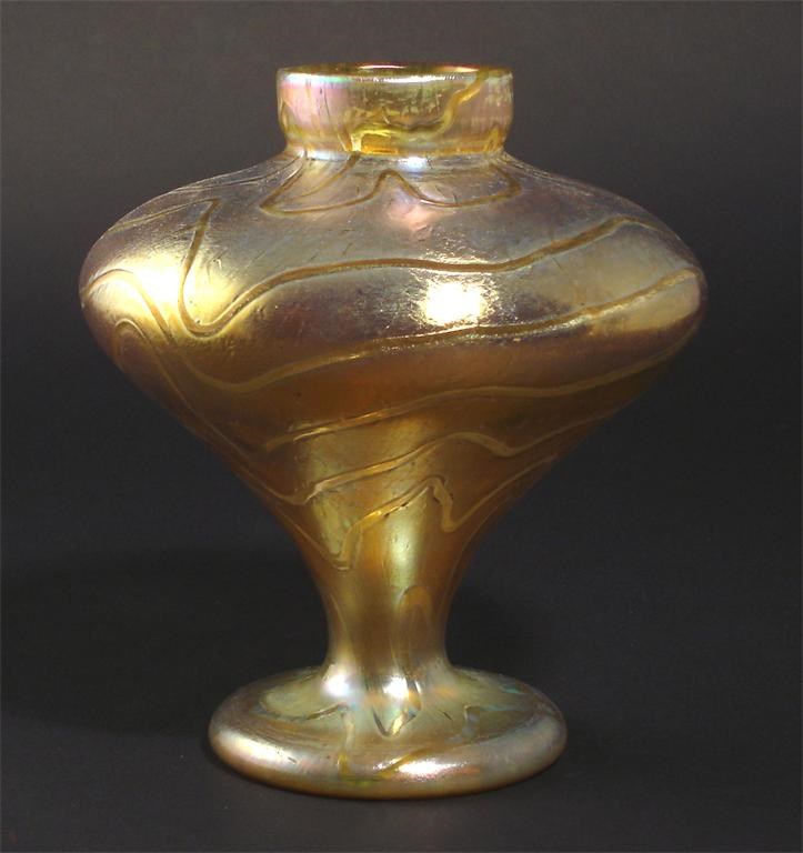 A Loetz glass vase swollen cylindrical form on applied foot, covered in an iridescent finish with resist decorated wavy lines unmarked 18cm. high