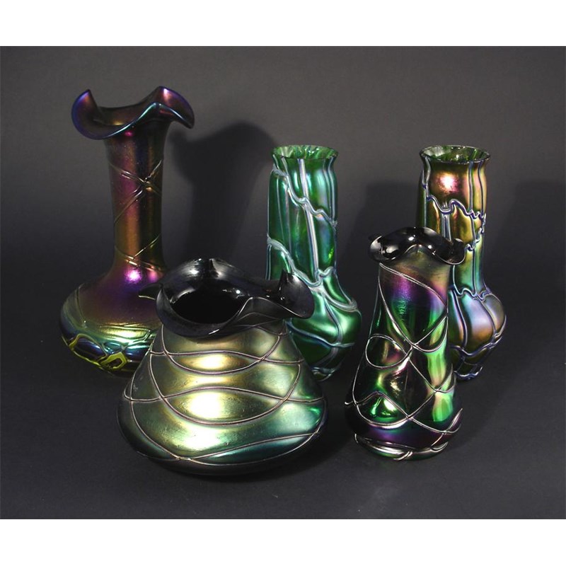 An Austrian iridescent glass vase probably Palme Koenig, and four others similar unmarked tallest 27cm. high