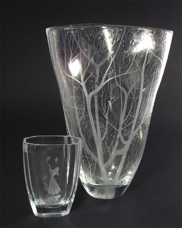 'Spring' a Kosta acid etched vase decorated with birds in trees, and two small Scandinavian glass vases etched marks 32cm. high