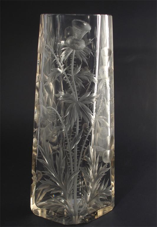 A Moser Karlsbad cut and etched glass vase octagonal section, cut and etched with flowering thistles etched mark Moser Karlsbad to base, minor nicks 40cm. high