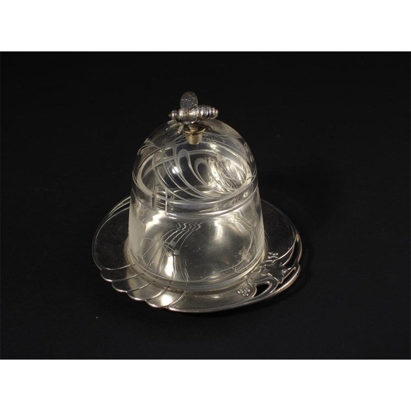 A WMF electroplate and glass honey pot, cover and saucer the domed glass body etched with berried foliage, surmounted with a bee finial, the tray with similar berried ivy sprays stamped marks to base 11cm. high