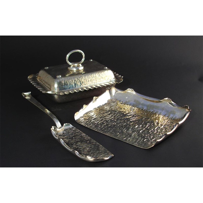 A Hukin & Heath electroplated crumb slice and tray model no.4414, hammered ripple finish, a tureen and cover similar model no.9296 and a small pair of plated sugar tongs stamped marks tray 24cm. wide