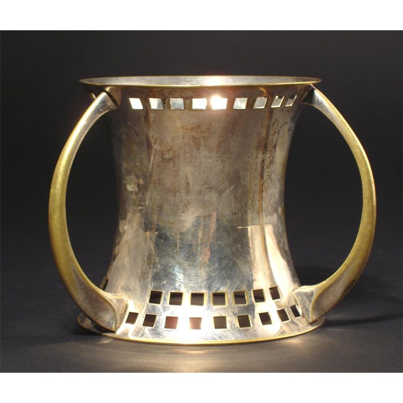 A continental electroplated stand in the style of the Wiener Werkstatte and Josef Hoffmann, waisted form with three lug handles, with frieze of pierced squares unmarked 10cm. high