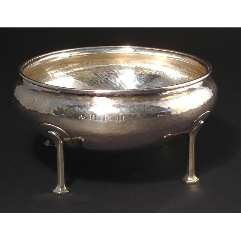 A George Connell silver rose bowl hammered bowl raised on four hexagonal legs stamped marks G L C...
