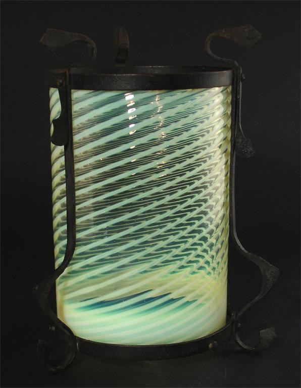A cast iron and vaseline glass lantern in the style of W.A.S Benson