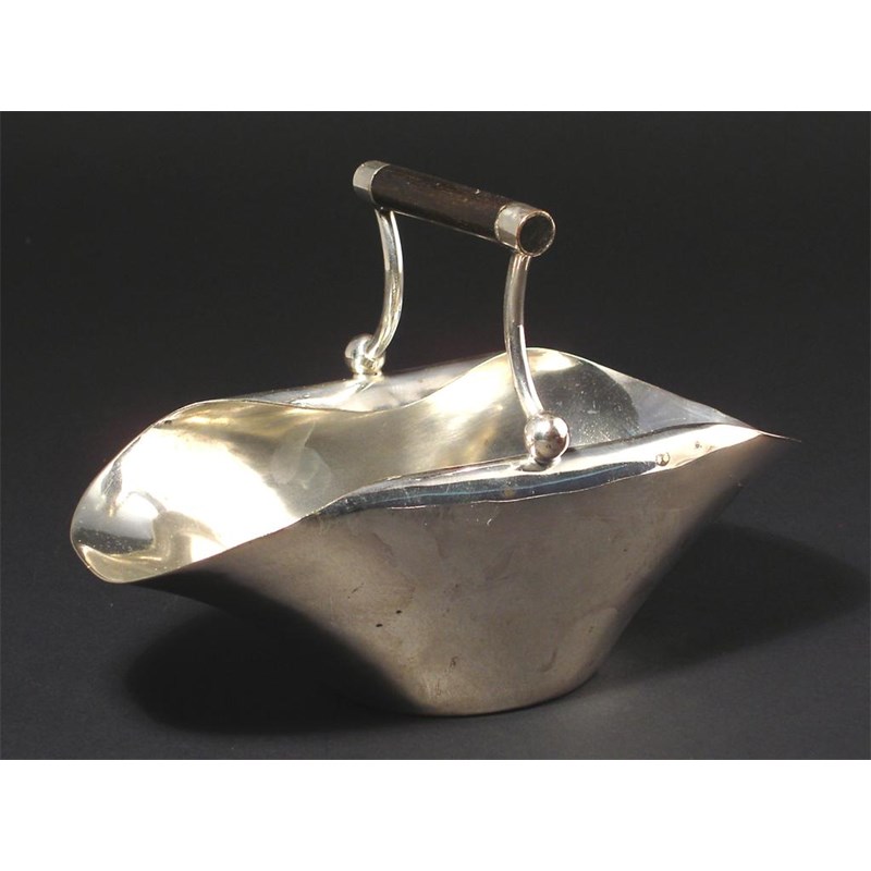 A Hukin & Heath electroplate and ebonised wood sugar basin model no.2997, after a design by Dr Christopher Dresser, stamped marks 13cm. high