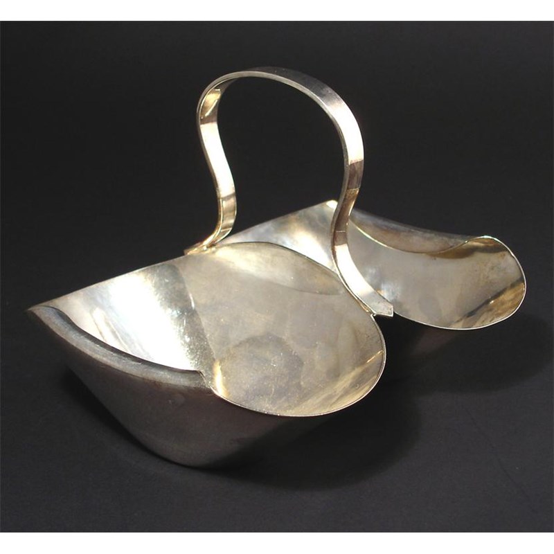 An electroplated twin-compartment bonbon dish in the style of Dr Christopher Dresser, stamped marks R & B 2700 19.5cm. wide This shape was originally manufactured by Hukin & Heath, model no.2223