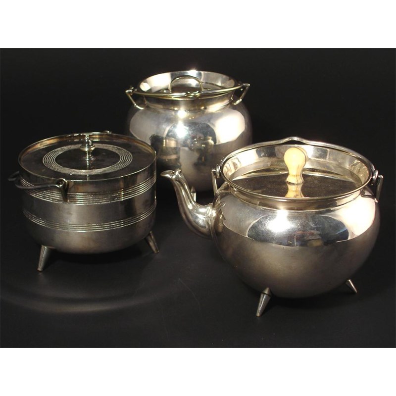 An electroplated kettle and cover with ivory finial in the manner of Dr Christopher Dresser, cauldron form, a large sugar basin and cover similar and a another similar stamped marks 13cm. high