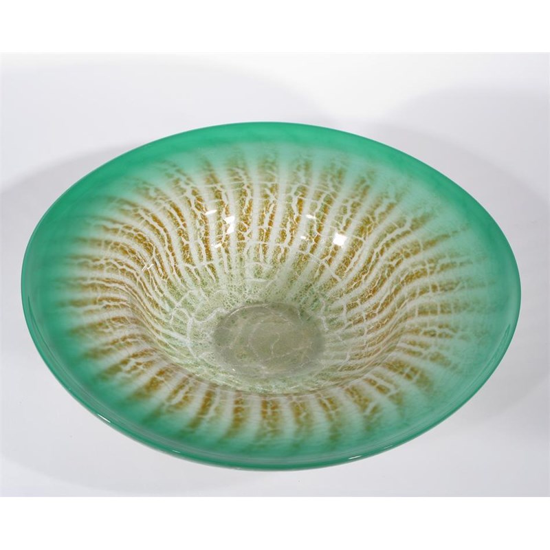 A W.M.F Ikora glass bowl clear glass with crackled green and red ribs, unmarked 37cm. diam.