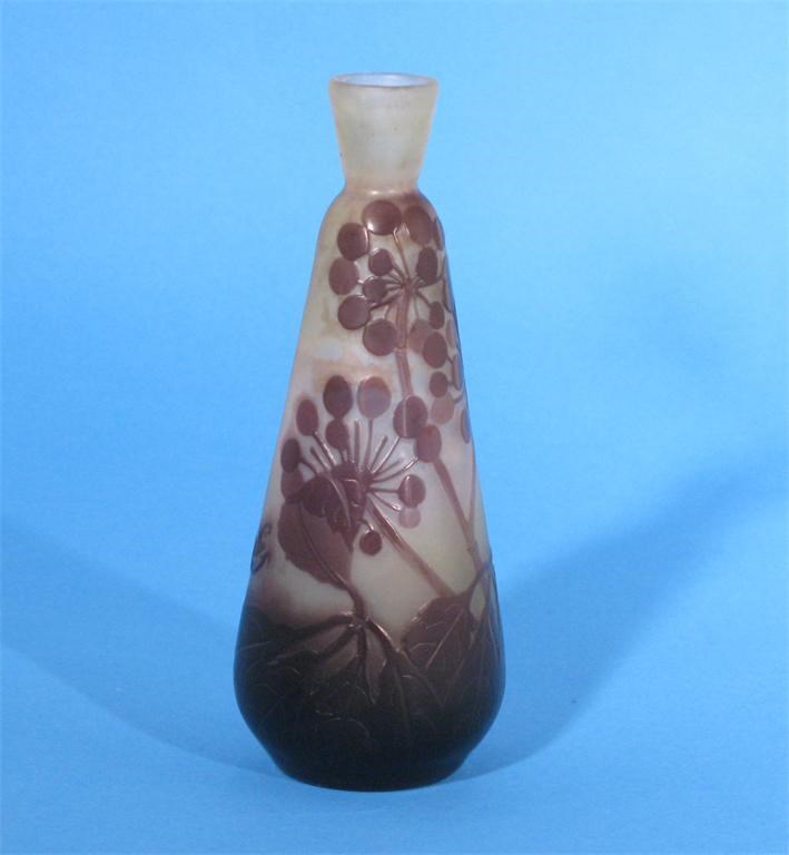 A Galle cameo overlay glass vase shouldered form, decorated in aubergine with seedheads, over mottled yellow came signature Galle 16.5cm. high