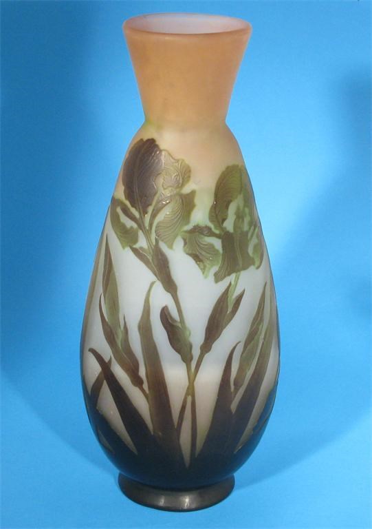 A large Galle cameo glass vase shouldered form, brown and yellow over graduated pink with flag iris stems cameo Galle signature 40cm. high