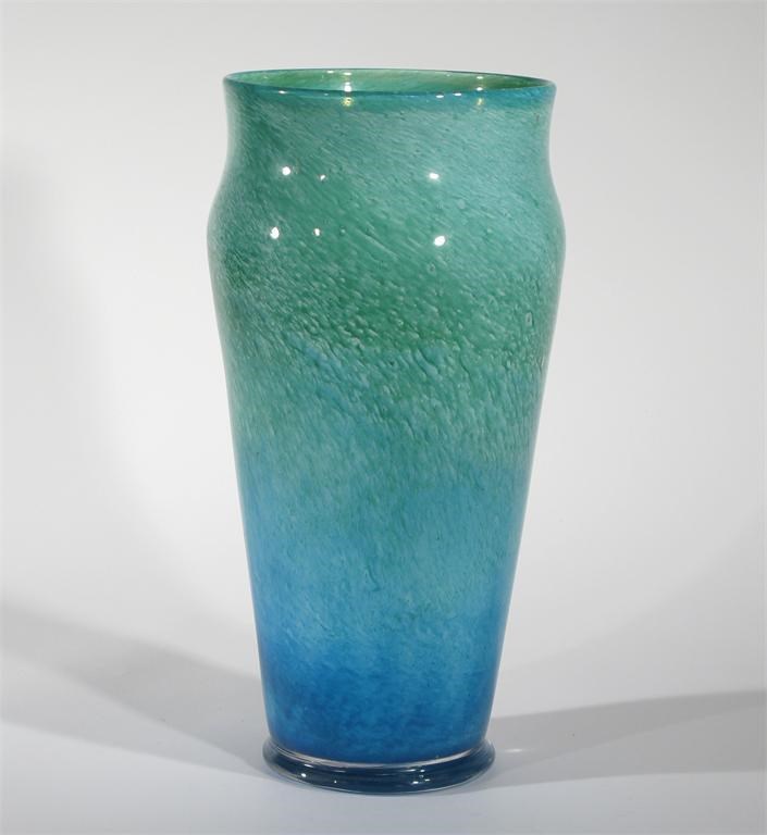 A Whitefriars Cloudy glass vase designed by Harry Powell, slightly shouldered form, blue graduating to green with white and air-bubble inclusions, on applied clear foot unsigned 26.5cm. high Literature Lesley Jackson Whitefriars Glass Richard Dennis Publications, page 119 plate 96 for a comparable example