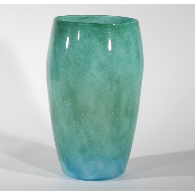 A Whitefriars Cloudy glass vase swollen cylindrical form, green glass graduating to blue foot, with white and air bubble inclusions, cased in clear unsigned 23cm. high