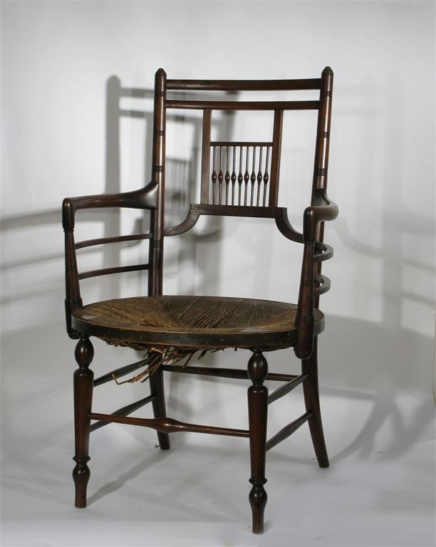 An Anglo Japanese chair in the manner of E W Godwin, circular rush seat, with curved arms, the back with simple turned splat panel unsigned 94cm. high