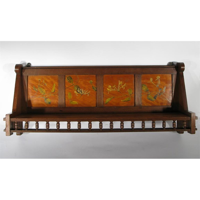 An Aesthetic Movement wall shelf peg-joint construction, with turned wood under tier, with four painted back panels of honeysuckle unsigned 68.5cm. wide