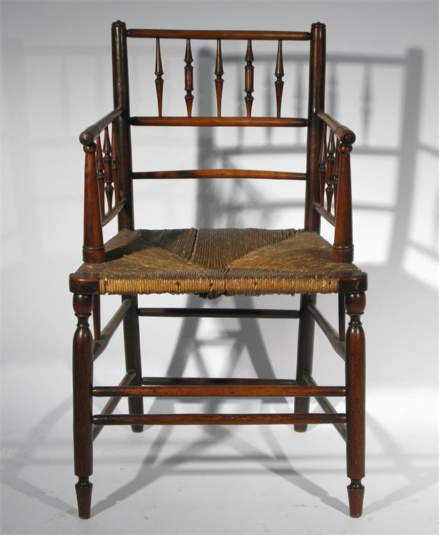 A rush seated Sussex armchair with turned bobbin back splats unmarked 84cm. high