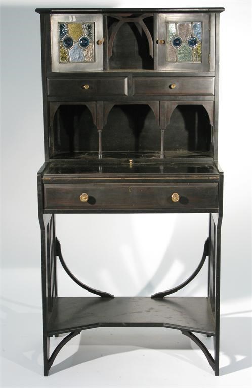 A Maples Aesthetic Movement ebonised wood bureau bookcase with fold down desk unsigned 133cm. high Pauleen Agius British Furniture 1880-1915, ACC publishing, page 142 plate 231 for a drawing of this design illustrated from the Cabinet Maker, January 1899.