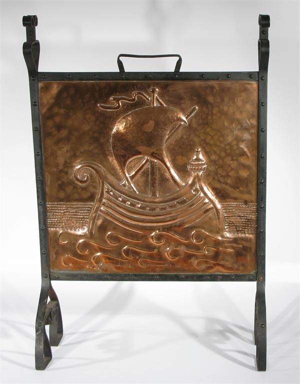An Arts and Crafts copper and iron firescreen possibly by John Pearson, hammered in low relief with a galleon at sail unsigned 80cm. high