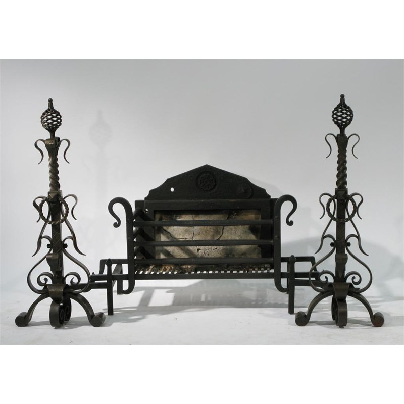 A large burnished iron fireplace from Bolney Court, Oxfordshire, with grate, ashtray and firedogs, the dogs with twist and scroll stems unmarked 151cm. wide