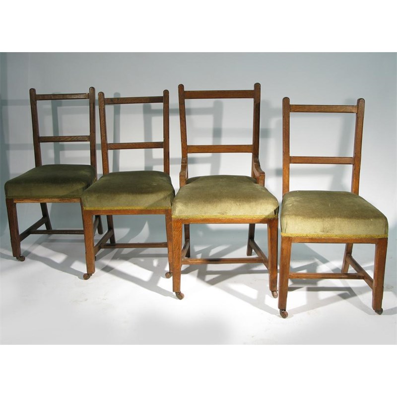 A set of Blythe & Sons oak dining chairs comprising one carver and five chairs, with green padded seats applied labels 91cm. high
