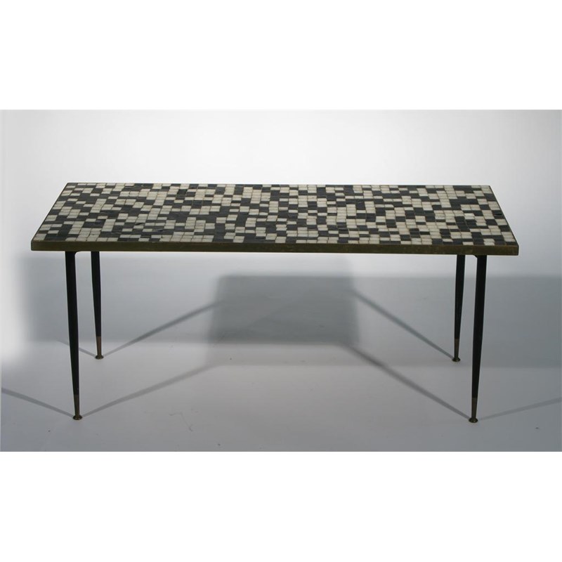 An English 1950s mosaic topped coffee table black and white mosaic design, on cast iron base applied paper label, artists indistinct signature 94 x 41cm.