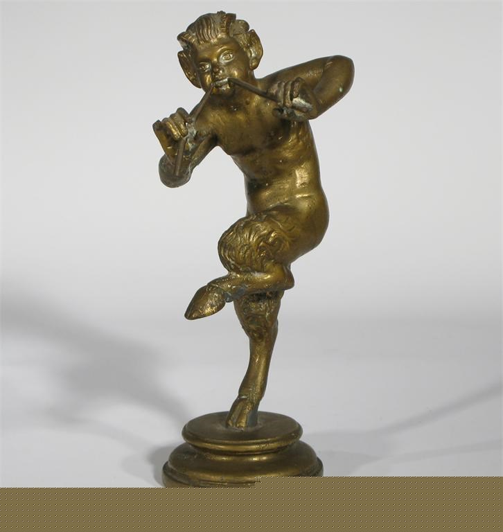 A gilt metal figure of Pan modelled standing on one leg playing two pipes unsigned 25cm. high