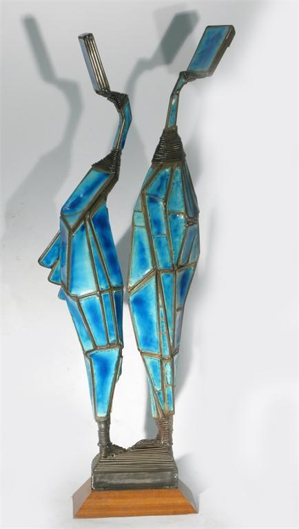 'Two Figures' a glazed tile and steel sculpture by Ivor Burge on wooden base unsigned 137cm. high