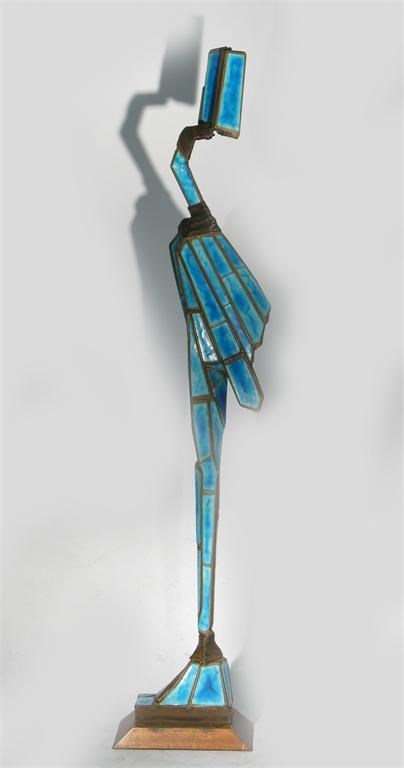 'Standing Figure' a glazed tile and steel sculpture by Ivor Burge on wooden base unsigned 204cm. high