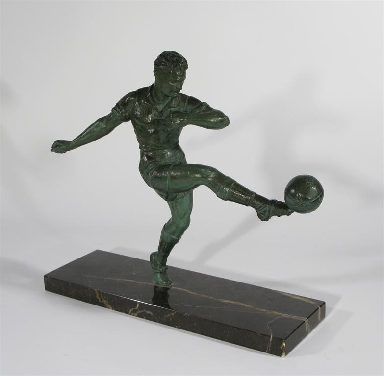 A Verdi Gris figure of a footballer cast from a model by G. Hervor, on striated marble base signed to the base 32.5cm. wide