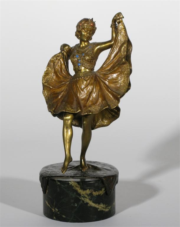 A cold-painted bronze model of an exotic dancer cast from a model by Franz Bergman, with hinged dress, on marble base signed in the cast Namgreb, with vase cypher 19.5cm. high