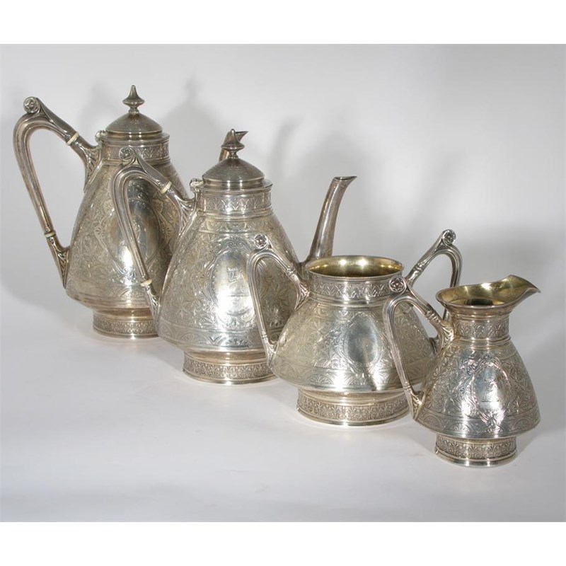 An Elkington & Co silver four piece Aesthetic Movement tea set model no.13055, stamped and etched with passion flowers, comprising; teapot with hinged cover, hot-water pot and cover, milk-jug and sugar basin stamped marks, Birmingham 1877 25cm. high