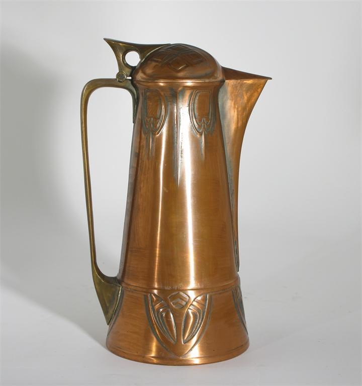An Eduard Hueck patinated copper and brass jug designed by Albin Muller, stamped in low relief with secessionist motif stamped marks, AM monogram 29.5cm. high Literature Brohan Museum Modern Art of Metalwork page 186 catalogue number 165 for a similar form in pewter