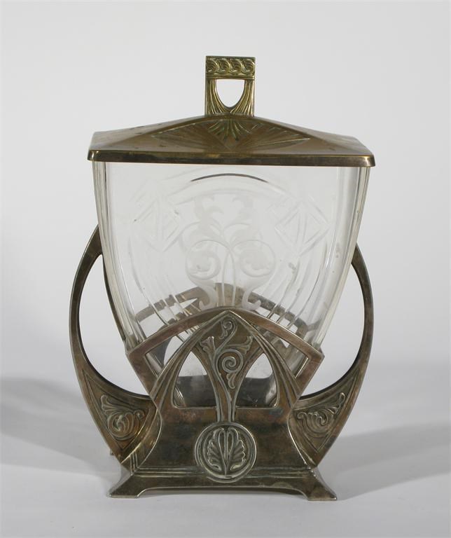 A WMF pewter and glass biscuit barrel rectangular section cast in low relief with floral panels, the glass etched with similar panels stamped mark 22cm. high