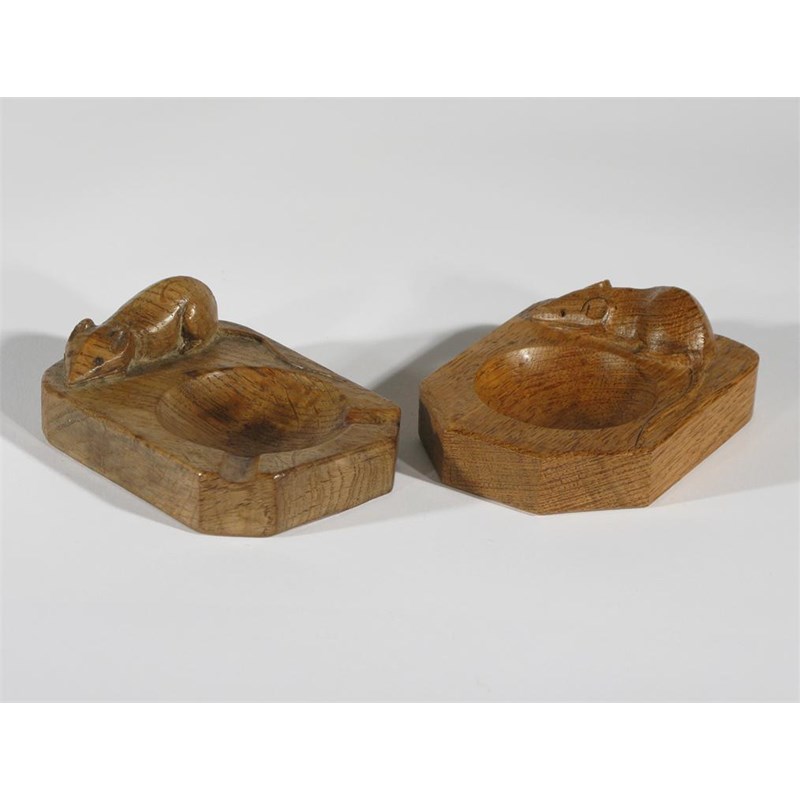 A pair of Robert 'Mouseman' Thompson oak ashtrays each with carved mouse signature 10.5cm. wide