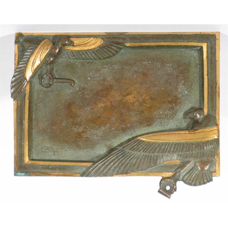 An Art Deco style verdi gris bronze dish cast from a model by Clenf with Egyptianesque vultures signed in the bronze 13cm. wide
