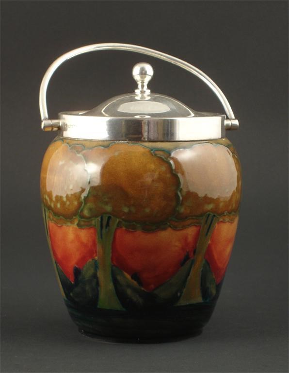'Hazledene' a Moorcroft Pottery biscuit barrel with electroplated mount and cover designed by...