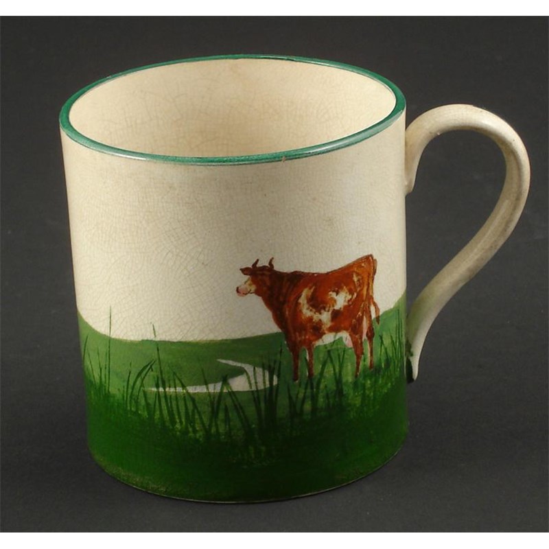 A Wemyss pottery mug painted with a cow in a landscape