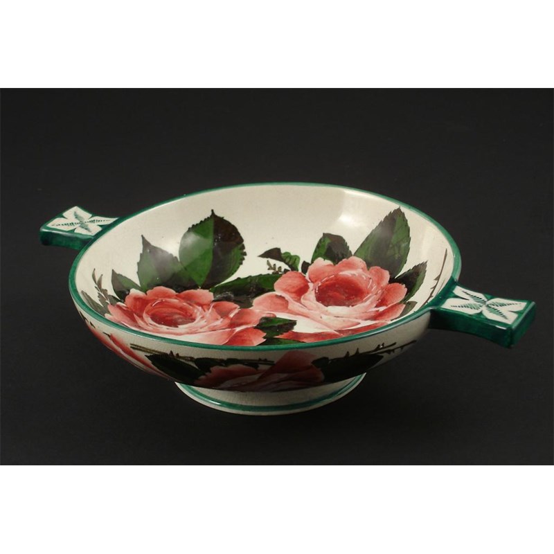 'Cabbage Rose' a Wemyss pottery quaiche painted in shades of green and pink on a white ground impressed and printed marks, restored foot rim 27cm. wide