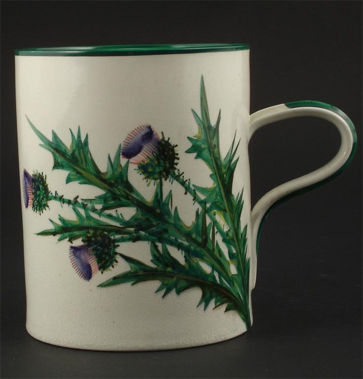 'Thistle' a Wemyss pottery tankard painted in shades of purple and green on a white ground...