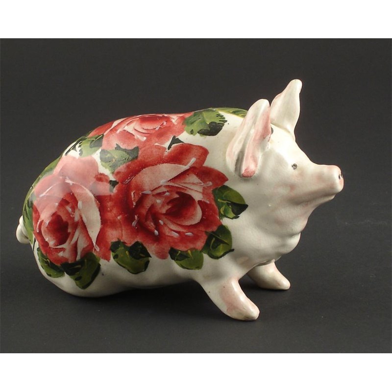 'Cabbage Rose' a Wemyss pottery pig painted in shades of pink and green on a white ground...