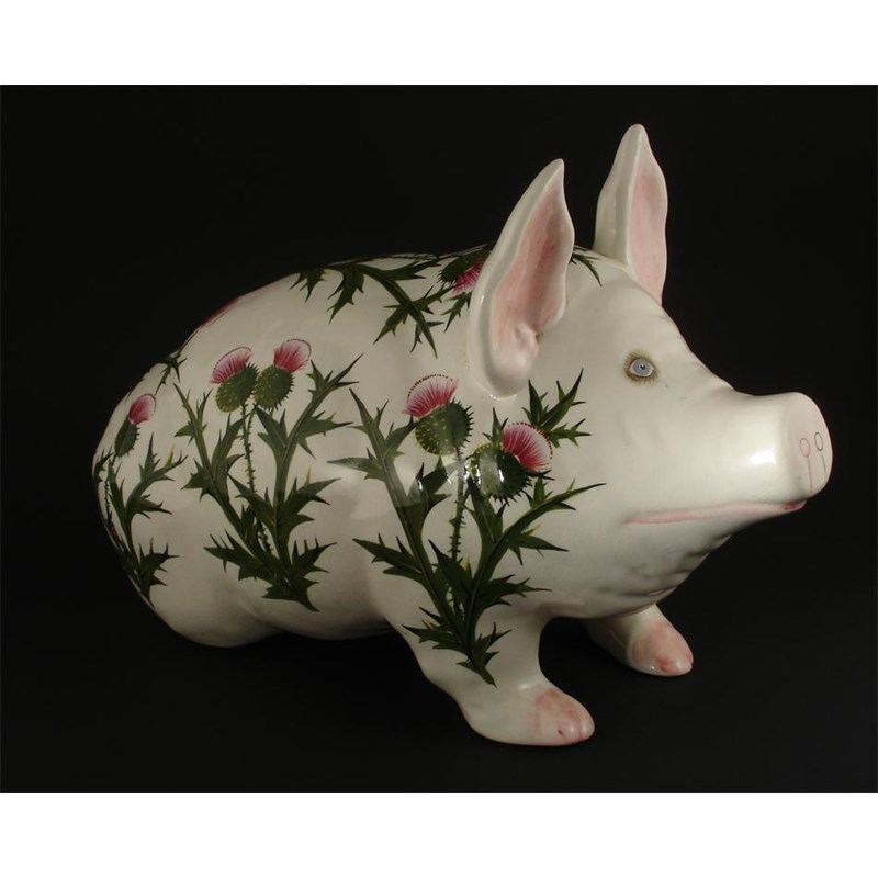 A large Plichta pottery pig designed by Joseph Nekola, painted with thistles in shades of pink, green and yellow on a white ground printed and painted marks 45cm. long