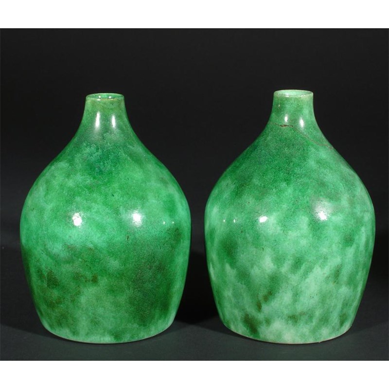 A Pair of Ashby Guild stoneware solifleur vases covered in a mint green glaze impressed Ashby Guild mark, repaired neck to one 12.5cm. high