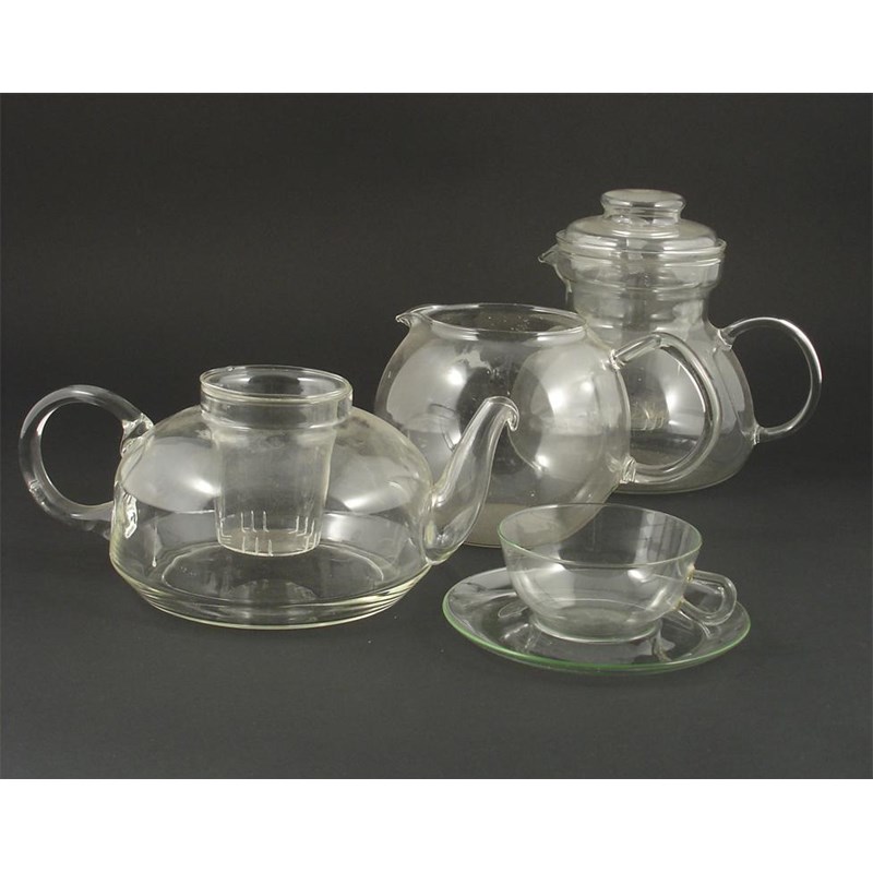 A Jena Glaswerke glass tea set designed by Wilhelm Wagenfeld, comprising; teapot and filter, coffee pot, filter and cover, water jug, ten various cups and twelve saucers, some saucers and cups acid etched Jena Therm teapot 11.5cm. high