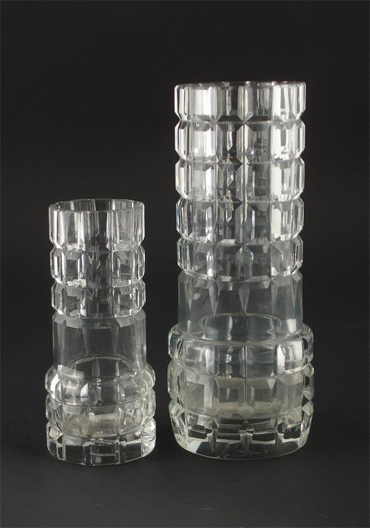 A pair of cut glass vases the design attributed to the Wiener Werkstatte, possibly designed by Otto Prutscher, cylindrical form deeply cut with squared design acid etched WW mark tallest 22.5cm. high