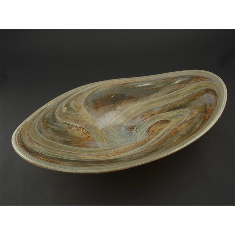 A large early Sam Herman glass bowl irregular form, decorated with green, white and brown swirls, cased in clear applied label, etched Sam Herman 1974 48cm. wide.