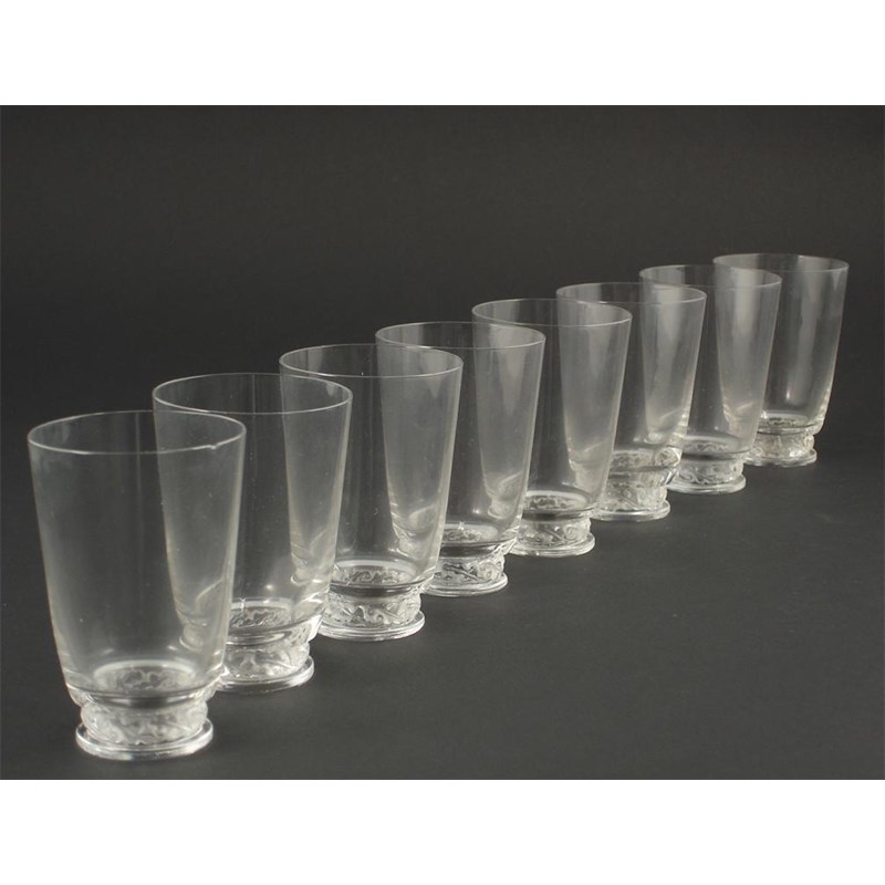 Eight Modern Lalique clear and frosted glasses with simple scrolling foliage band etched Lalique France 9.5cm. high