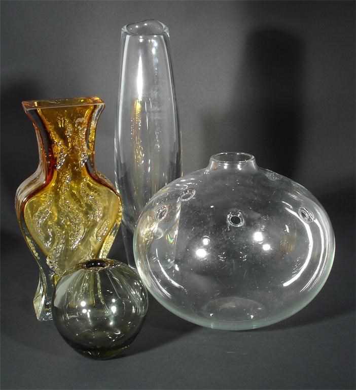 A Holmegaard glass vase ovoid with six aperture to the shoulder, two other Holmegaard vases and an amber vase probably Riihimaki, and four other glass items various marks 19cm. high