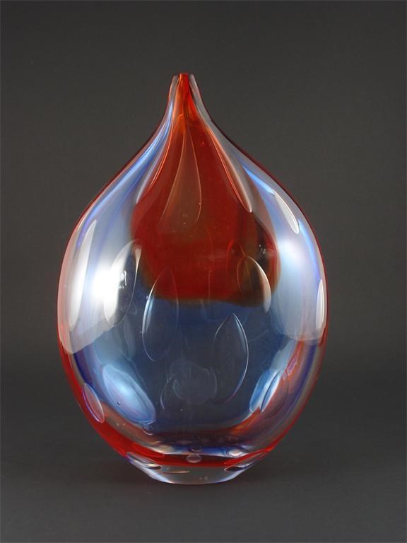 A large Italian glass vase red and blue with large air bubble inclusions, cased in clear etched indistinct signature 41cm. high