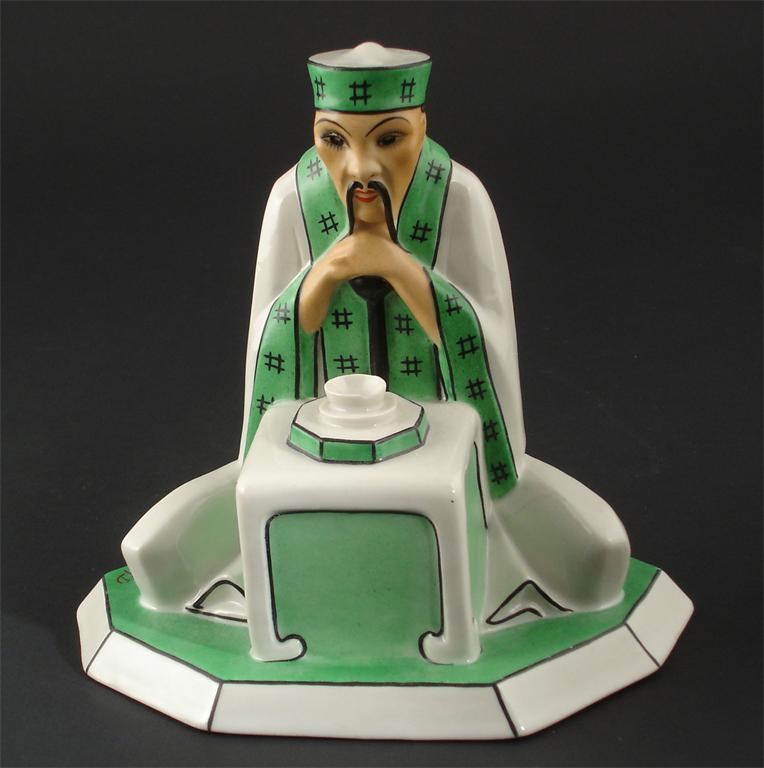 An Editions Etling pastille burner by A Godard, modelled as a Chinaman, seated before a table printed marks, small chip to tea cup 17cm. high